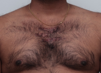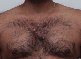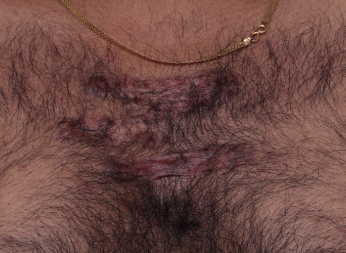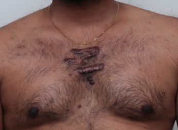 Well 30-year-old man with a long history of struggling to manage multiple chest keloids. He regularly experienced itchiness and discomfort, which were often exacerbated by activities such as exercise or warmer weather.